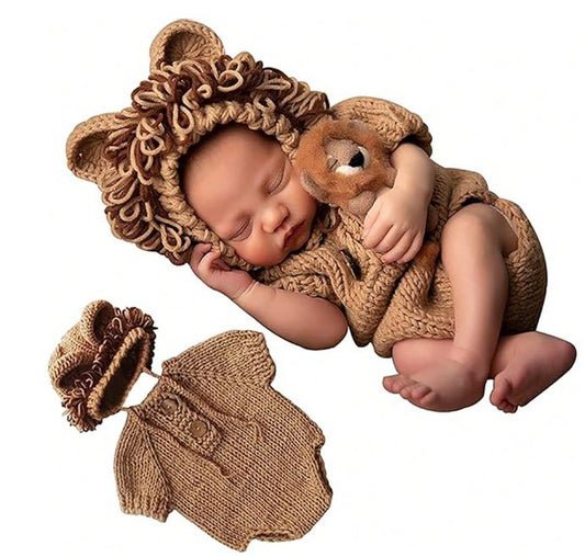 1 Set Newborn Photography Costume, Crochet Knitted Lion Animal Style Romper With Hat Baby Outfit